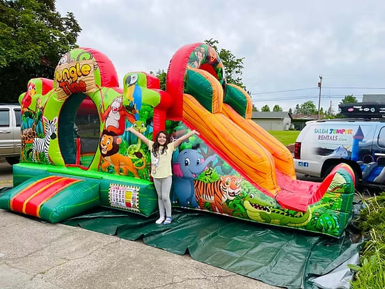 Whether you’re hosting a birthday bash, school event, or community gathering, the Jungle Time Funsize Combo is your ticket to an unforgettable day. Its compact size ensures it fits comfortably in most residential yards, making it an ideal choice for parents seeking hassle-free party planning. If your party has big AND little kids, consider booking this one and our large jungle combo! 🎉🐒