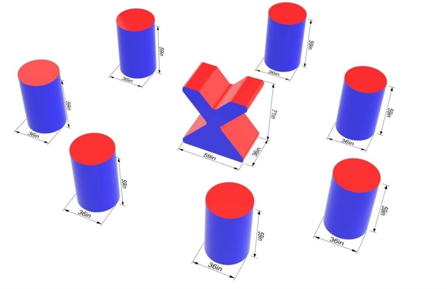 - 7 round columns: 5 ft tall × 3 ft diameter — perfect for quick cover and dramatic peeks.