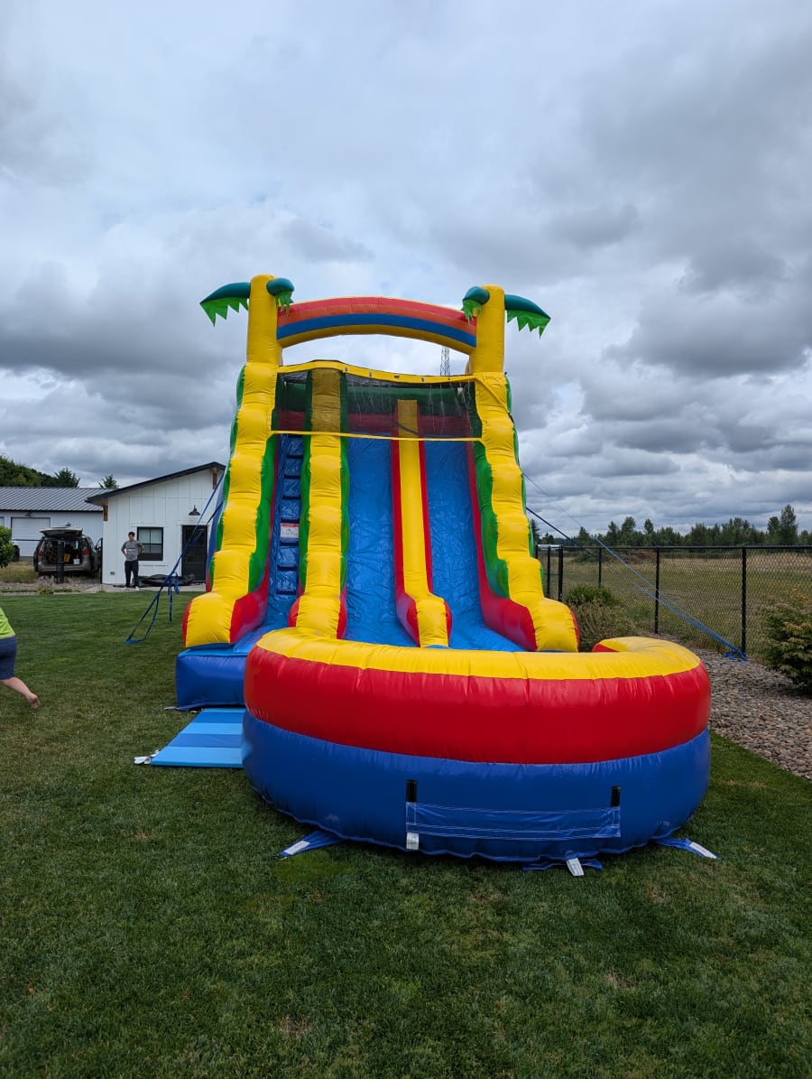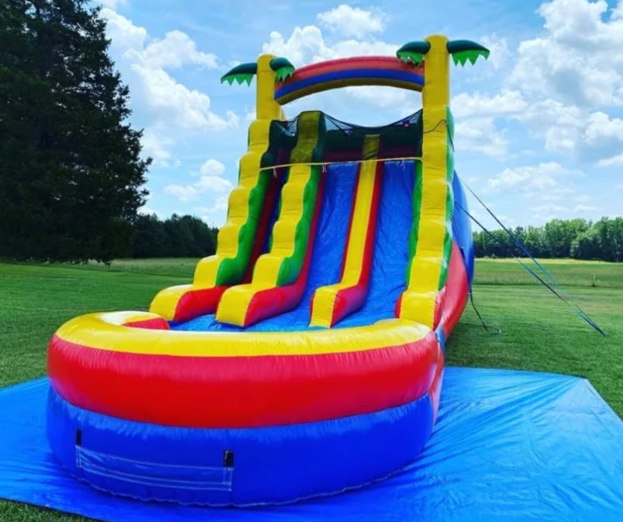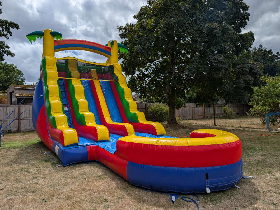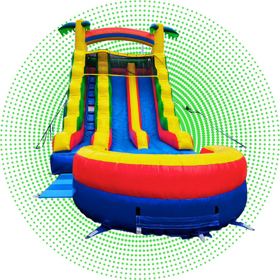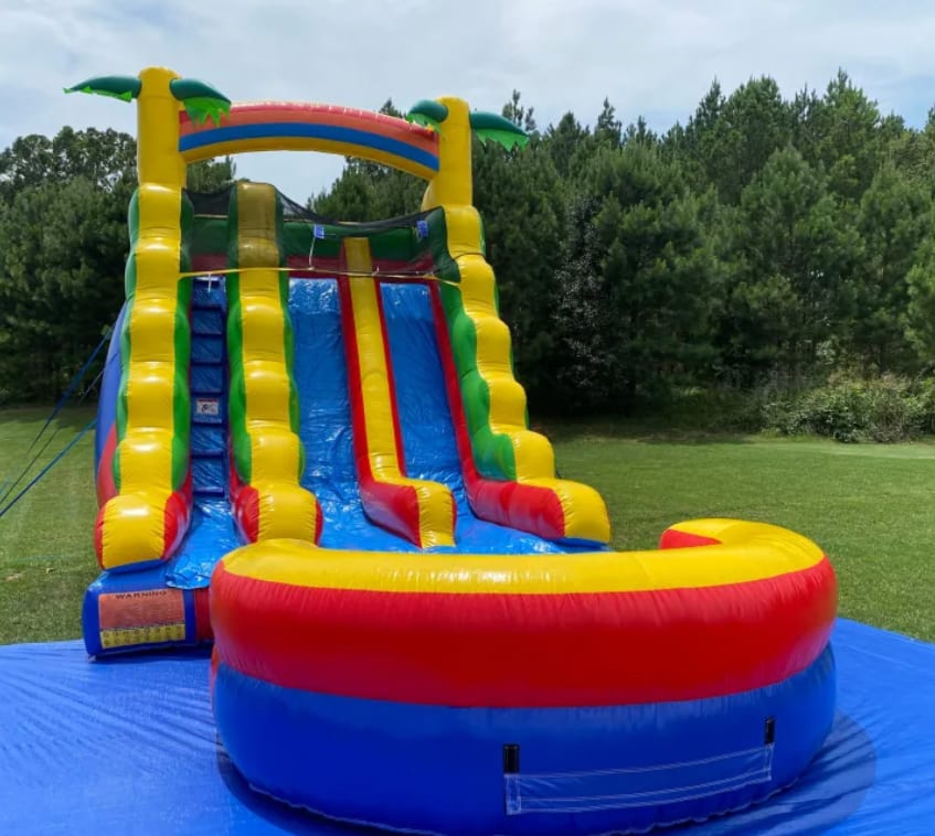The Colossal Colorblock Double Slide is large, gorgeous, brand new and fabulous fun for adults or kids. Just what you need for your next event! Standing an impressive 18 feet tall, this giant inflatable slide is a showstopper that will keep guests of all ages entertained for hours. Perfectly blending vibrant colors with a playful tropical theme, the palm trees add that extra splash of paradise to your backyard or event space.