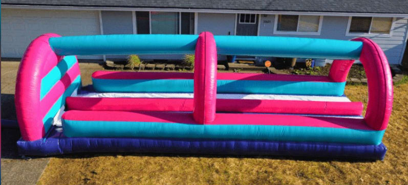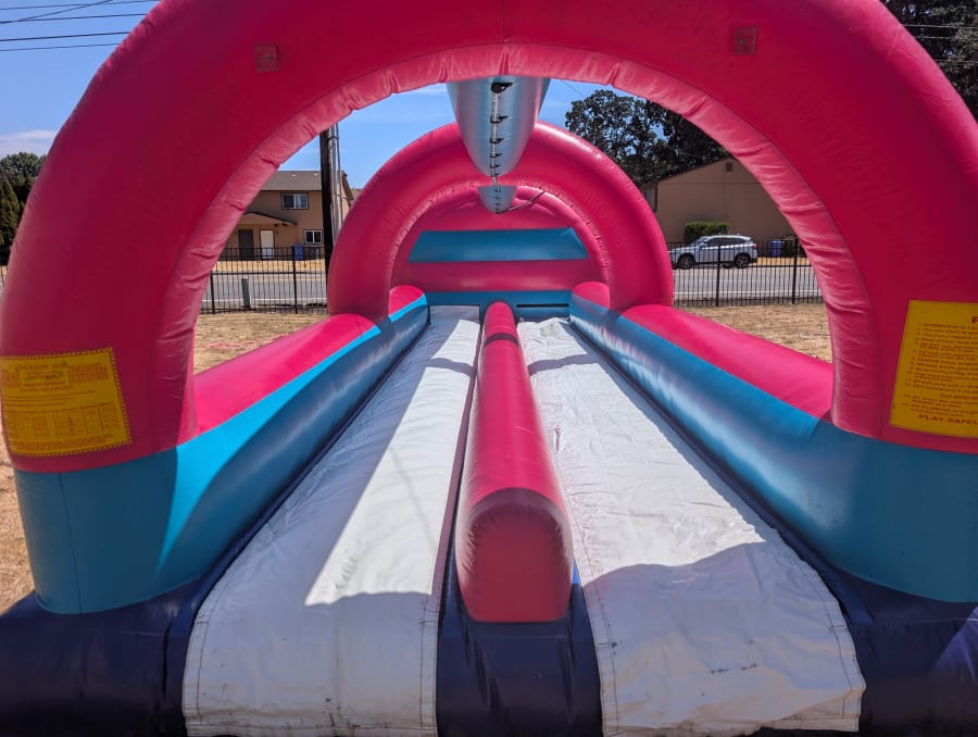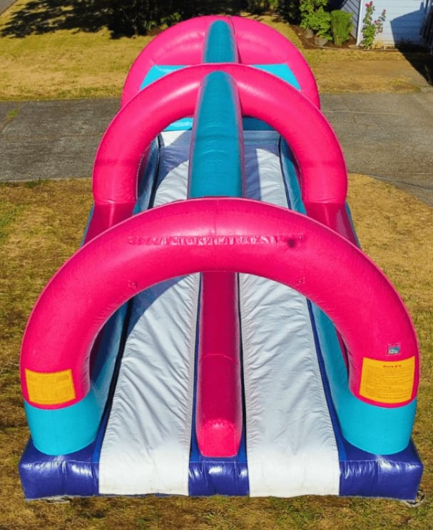 Bring the electrifying energy of the 80s right to your backyard with our "Back to the 90s" Dual Lane Slip N Slide. This show-stopping slip n slide is not just a way to cool down — it's a blast from the past and an adrenaline-packed adventure for both kids and adults! Its retro pink and teal colors instantly set the vibe for an unforgettable party, making it a highlight attraction at any gathering. Water sprays from above and you can race your friends to the end of this totally tubular slip n slide rental at your next Salem, Oregon party!🌴🕶️